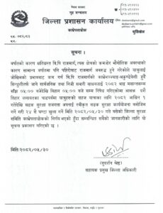 जिल्ला प्रशासन कार्यालय काभ्रेपलाञ्चोककोे सुरक्षा समितिको बैठकले मनसुन बाहिरिने क्रम र दशै–तिहार लगायतकाका चाडपर्वका लागि यात्रुहरुको सहजताका लागि सडक सुरक्षा कार्ययोजना बमोजिम असोज १ गतेदेखि २४सैँ घण्टा खुल्ला गर्ने निर्णय गरिएको हो । मंगलवार जिल्ला प्रशासन कार्यालय काभ्रेपलाञ्चोकद्वार जारी सार्वजनिक सूचना अनुसार २४सैँ घण्टा खुल्ला गर्ने निर्णय गरिएको हो ।